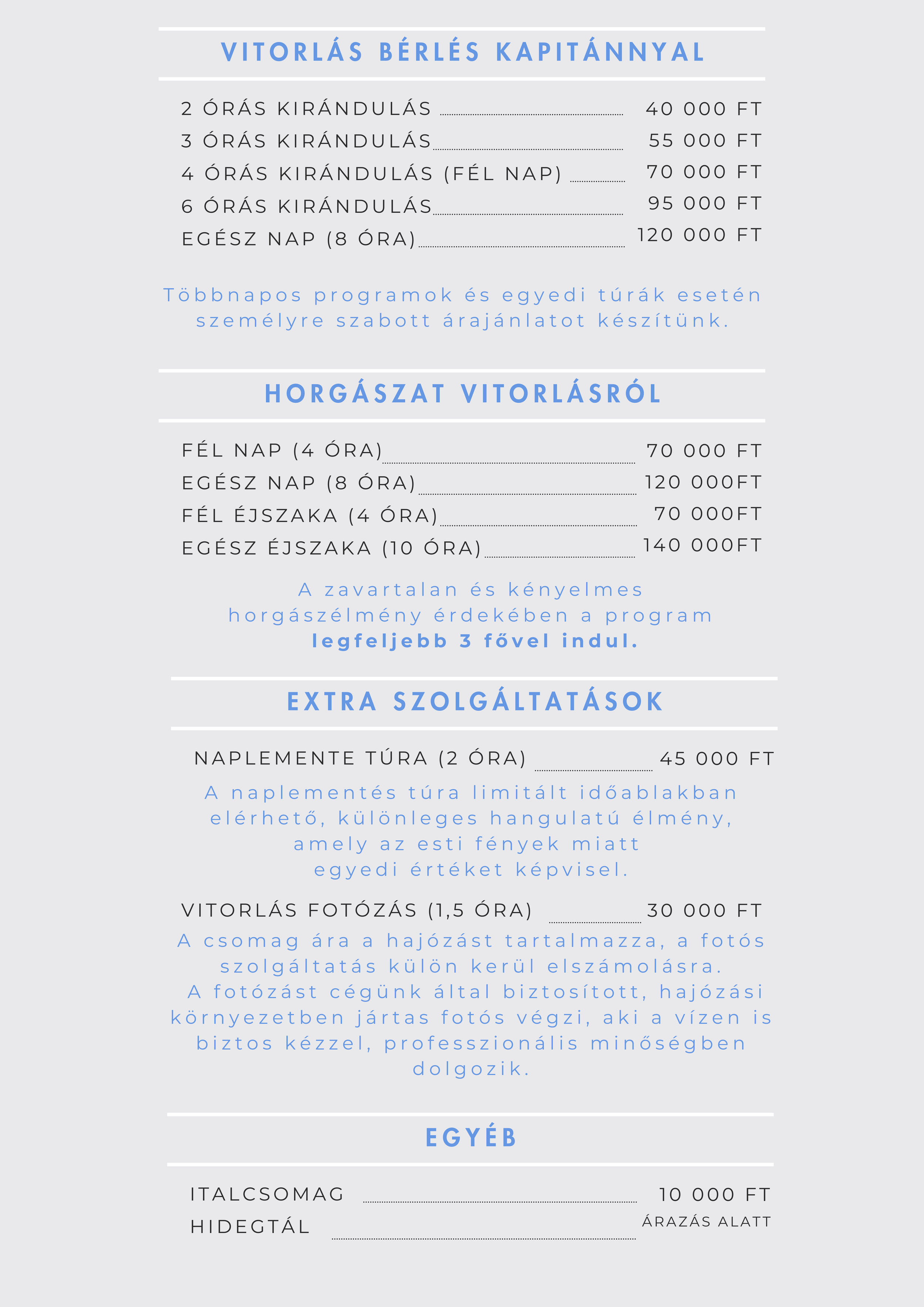 a szükséges szervizt, a hajó takarítását, és természetesen a kapitány díját is.